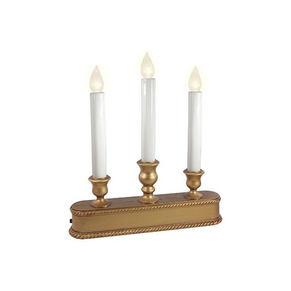 Sylvania 10 3 Light Gold Battery Operated LED Candolier Warm White LED Steady Or Flicker Flame Uses 3 D Batteries Not Included Sensor Turns On At Dusk & Off At Dawn Indoor Use 9.25W x 2D x 10H.