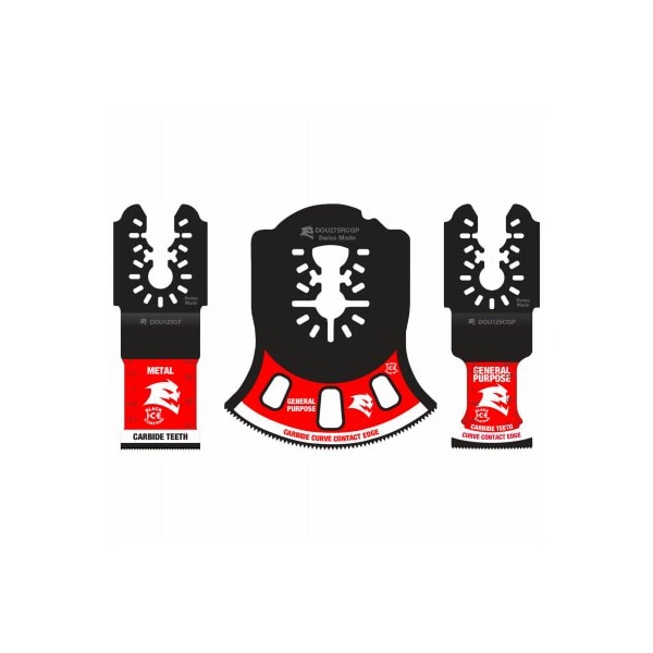 Diablo, 3 pack of universal fit carbide oscillating carbide blade Diablo's universal fit carbide oscillating blades feature application specific designs that deliver extreme durability and superior cutting life in multiple applications ranging from nailembedded wood, clean wood, metal and plastics Highperformance carbide teeth deliver an unmatched up to 50 times longer cutting life versus standard bimetal blades Curve contact edge creates a pilot for precise, clean plunge cuts with less vibration An optimized blade design and black ICE industrial cooling element keeps the teeth cool and build up free for fast, clean cuts The blade's universal fit, adapterfree design easily attaches to most tools, with the exception of starlock tools