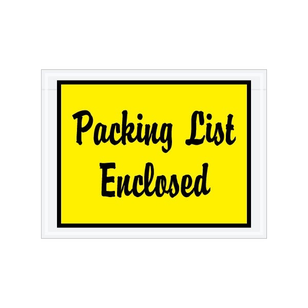 Pressure sensitive packing list envelopes secure and protect documents that are attached to the outside of shipments. Full face, colored Packing List Envelopes are pre-printed with ''Packing List Enclosed'' in script font on heavy 2 Mil poly; Hot melt adhesive backing provides strong adhesion to paper and corrugated products; Envelopes open along the first dimension. Sold in a quantity of 1000 per case.