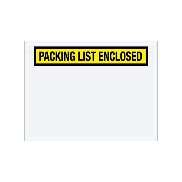 Pressure sensitive packing list envelopes secure and protect documents that are attached to the outside of shipments. Panel face, colored Packing List Envelopes are pre-printed with ''Packing List Enclosed'' on heavy 2 Mil poly; Hot melt adhesive backing provides strong adhesion to paper and corrugated products; Envelopes open along the first dimension. Sold in a quantity of 1000 per case.