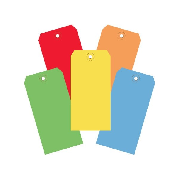 Colored tags aid in coding shipments and inventory. Packs include 200 each of Red, Blue, Green, Yellow and Orange Tags; Tags feature a 3/16'', reinforced, tear resistant eyelet; Tags may be attached with string or wire; 12'' cotton string available G2501; 12'' wire available G2500. This product is equivalent to part number: S-15229. Sold in a quantity of 1000 per case.