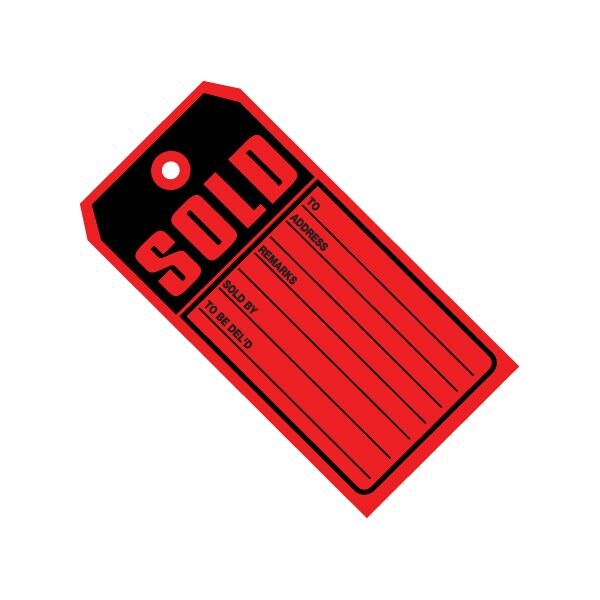 Bright red tags identify SOLD items. #5 - 4 3/4 x 2 3/8''; Pre-printed area for entering sale and delivery information; Tags feature a 3/16'', reinforced, tear resistant eyelet; Tags may be attached with string or wire; Pre-cut, 12'', unpolished cotton tag string available stock number G2501; Pre-cut, 12'', 26 gauge tag wire available stock number G2500. Sold in a quantity of 500 per case.