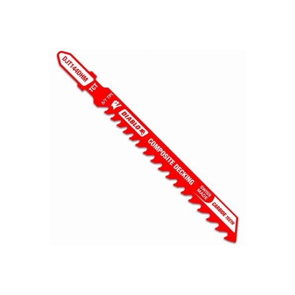 Diablo, 4 57 TPI carbide Tshank jig saw blade for composite decking Diablo's carbide teeth jig saw blades deliver extreme durability and superior cutting life in composite decking materials Highperformance carbide teeth provide an unmatched up to 50 times longer cutting life versus standard jig saw blades The optimized blade design and permashield nonstick coating reduces heat for fast and effortless meltfree cuts Tshank design fits all combo and most Ushank cordless and corded jig saws