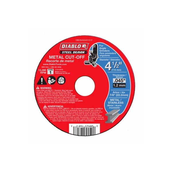 Diablo Steel Demon 412 In Type 1 Metal Cut Off Disc Diablo's Steel Demon Metal Cut Off Discs Deliver Industrial Performance, Increased Productivity And Longer Cutting Life Featuring A Premium Ceramic Blend That Produces Quick Cuts That Deliver Up To 6X Longer Life Fully Reinforced For HandHeld Work, These Discs Are Ideal For Cuts And Working In HardToReach Areas