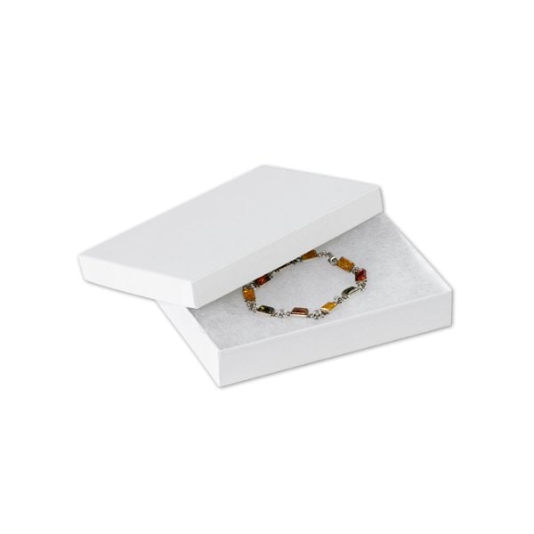 Great for jewelry and other small items. High quality two-piece construction; Fully assembled to save time; Each box is filled with non tarnishing jeweler's cotton; Constructed from rigid white lined fibreboard; Recommended uses: Bracelet, Small Necklace. This product is equivalent to part number: S-9812. Sold in a quantity of 100 per case.