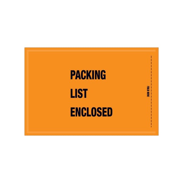 Pressure sensitive packing list envelopes secure and protect documents that are attached to the outside of shipments. Full face, fluorescent orange Packing List Envelopes are pre-printed with ''Packing List Enclosed'' on heavy 2 Mil poly; Hot melt adhesive backing provides strong adhesion to paper and corrugated products; Envelopes open along the first dimension. This product is equivalent to part number: S-2116. Sold in a quantity of 1000 per case.