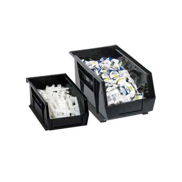Keep small parts organized. Durable plastic construction; Flat front panel is perfect for labeling; Bins stack to save space; Maximize the efficiency of bins by using Bin Divider stock number BIND101; May be used with Bin Organizers; Sold by the individual bin in case quantities; Inside Dimensions: 4 3/4 x 3 7/16 x 2 13/16''; Fits shelf size 5 3/8''; Optional Label Holders available. This product is equivalent to part number: S-12413BL. Sold in a quantity of 24 per case.