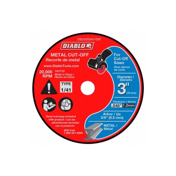 Diablo, 5 pack, 3 In Metal Cut Off Disc, Thin Kerf Diablo's Premium Metal Cut Off Discs Provide Superior Performance And Increased Productivity Featuring A Premium Aluminum Oxide Blend, These Discs Cut Through Material Faster Than Other Cut Off Discs And Offer An Extra Long Cutting Life Diablo's Thin Kerf Design Provides For A Thin, Fast Cut With Minimal Burr Formation Unlike Other Bonded Discs On The Market, This Cut Off Disc Is A True 4 In Design Fully Reinforced For Use In HandHeld Cut Off Work Ideal For Use When Working In Hard To Reach Areas
