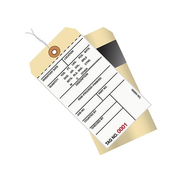 Use to keep your inventory in order. Size #8 - 6 1/4 x 3 1/8''; Printed white top sheet with 10 point manila base stock; Consecutively numbered on both copies; Adhesive strip on base ply; Tags feature a 3/16'' reinforced, tear resistant eyelet; Wired with 12'', 26 gauge wire; Additional wire available stock number G2500. This product is equivalent to part number: S-7227PW. Sold in a quantity of 500 per case.