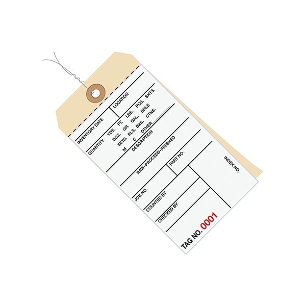 Use to keep your inventory in order. Size #8 - 6 1/4 x 3 1/8''; White carbonless bond with 10 point manila base stock; Tags feature a 3/16'' reinforced, tear resistant eyelet; Wired with 12'', 26 gauge wire; Additional wire available stock number G2500. This product is equivalent to part number: S-5590PW. Sold in a quantity of 500 per case.