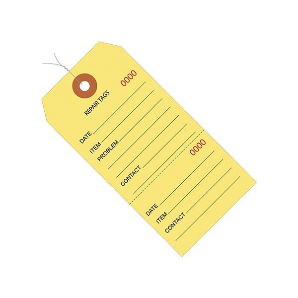 Keeps track of repair work. One part is given to the customer and the other stays with the product; Consecutively numbered; Pre-wired; 12'' wire available G2500. This product is equivalent to part number: S-10752YPW. Sold in a quantity of 1000 per case.
