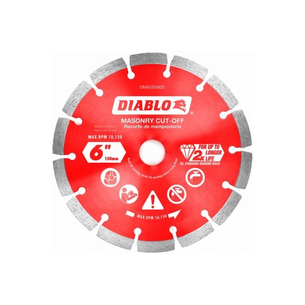 Diablo, 6 diamond segmented cutoff discs for masonry Diablo's diamond segmented masonry cutoff discs provide extreme durability and longer life in concrete, concrete with rebar, brick and cinder block These diamond rimmed discs deliver up to 2 times longer cutting life versus standard diamond cutoff discs The disc's industrialgrade diamonds with hardened disc body delivers lasting durability and maximizes cutting quality in hardened materials even in extreme applications