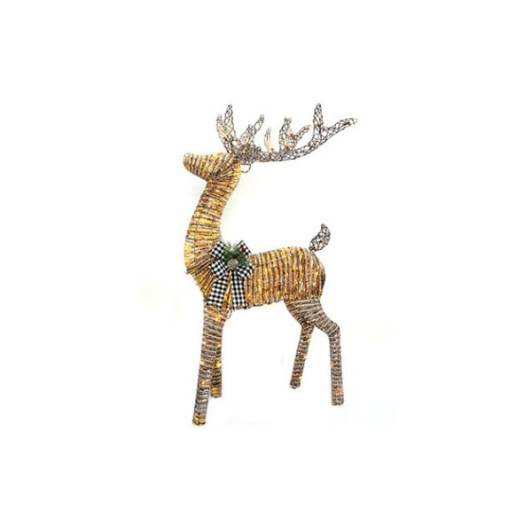 60 3D LED Faux Frosted Grapevine Standing Deer Yard Decor. 150 Warm White LEDs. Black/white buffalo check ribbons. Brown Wire. 60 lead cord. Indoor/Outdoor use. Includes 4 lawn stakes. Color Box. Holiday Wonderland Packaging. UL Listed.