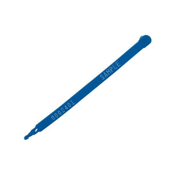 Fixed length security seal used to secure trailer doors and transportation equipment. Strongest plastic trailer seal available. Patented acetal locking chamber provides superior tamper resistance; Durable, all-plastic, one-piece construction; Weather resistant HDPE withstands extreme cold and heat; Consecutively numbered; Produced in easy-to-use strips of 20 with no plastic waste. This product is equivalent to part number: H-543BLU. Sold in a quantity of 100 per case.