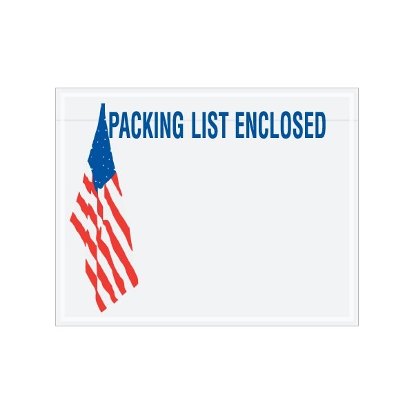 Pressure sensitive packing list envelopes secure and protect documents that are attached to the outside of shipments. Pre-printed with patriotic message and/or image on heavy 2 Mil poly; Hot melt adhesive backing provides strong adhesion to paper and corrugated products; Envelopes open along the first dimension. Sold in a quantity of 1000 per case.
