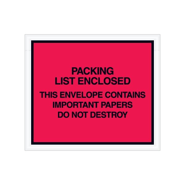 Pressure sensitive envelopes secure and protect documents that are attached to the outside of shipments. Pre-printed with ''Packing List Enclosed'', ''Important Papers'' and ''Do Not Destroy'' warnings; Hot melt adhesive backing provides strong adhesion to paper and corrugated products; Envelopes open along the first dimension; 1000 per case. Sold in a quantity of 1000 per case.