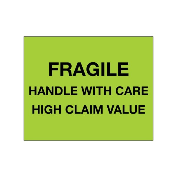 8 x 10'' - ''Fragile Handle With Care - High Claim Value'' Fluorescent Green Labels