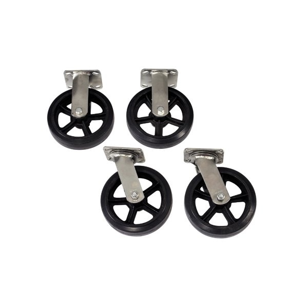 Casters are 8 x 2'' moldon rubber on cast iron hub. Caster sets includes: 2 swivel wheels and 2 rigid wheels. This product is equivalent to part number: H-3327S. Sold in a quantity of 4 per case.
