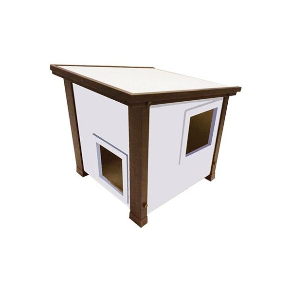 New Age Pet Ecoflex Albany Feral Cat House. Features a raised floor design and two entry/exit points for kittys safety. Backed by a 10-year limited manufacturer warranty. The ECOFLEX material is non-toxic eco-friendly and impervious to moisture and odor. This outdoor cat house Includes 1 vinyl door flap for each entry/exit point. Available in maple/brown and Mossy Oak Break-up Country.