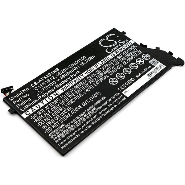 This is a replacement compatible with a Asus Laptop and Notebook BatteryVolts: 3.75V 3.75 VoltsCapacity: 4900mAh 4.9AhType: Li-PolymerColor: BlackAsus Transformer Book TX201LA TX201LA Replacement Batteries.Mfgr Part # 0B200-00600100 C11N1312Dimensions: 7.34 in. L x 3.73 in. W x 0.13 H in.Weight: 0.5 lbWarranty: 1 YearDisclaimer: Our products are not affiliated with or authorized by Asus.FAQsWhat is the best replacement battery for the Asus Transformer Book TX201LA TX201LA Laptop and Notebook Battery?The CS-ATX201NB is the best replacement battery for the Asus Transformer Book TX201LA TX201LA Laptop and Notebook Battery. What is your return policy and battery warranty?Our batteries are backed by easy 30-day returns and a 12-month warranty. How do I find the best replacement Battery?Our search tool at the top of the website should give you the best results. Search by brand or part number to see if we have the right match for you. What does Li-ion and Ni-MH mean?They represent different types of rechargeable batteries. Li-ion stands for Lithium Ion, lithium ions move from the negative electrode through an electrolyte to the positive electrode during discharge and back when charging. Ni-MH stands for nickel-metal hydride where the negative electrode is made from a hydrogen-absorbing alloy. Do you have a wholesale, reseller and large volume purchase program?Yes, our bulk purchasing program saves you money and allow you to obtain the batteries you need in one easy, hassle-free transaction. Apply here.