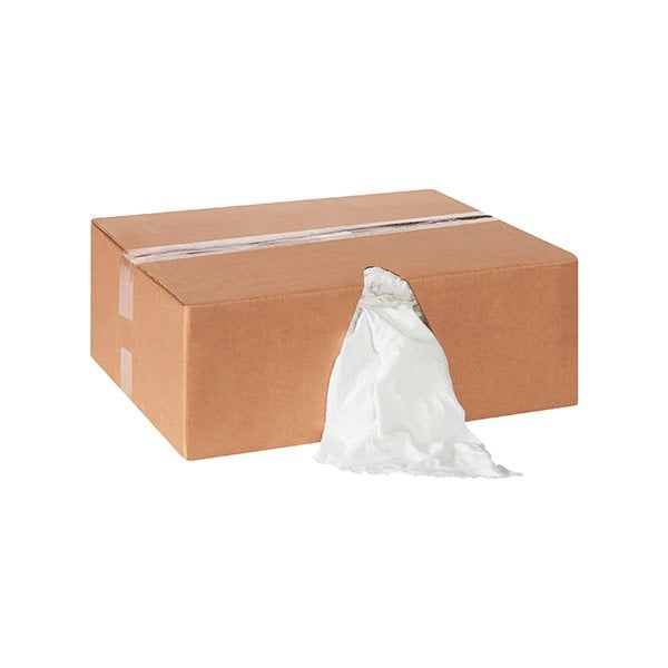 Rags in convenient dispensing boxes. Soft and absorbent; Cotton/polyester blend; Sanitized reclaimed white knit material; No small pieces and no printing. This product is equivalent to part number: S-7287.