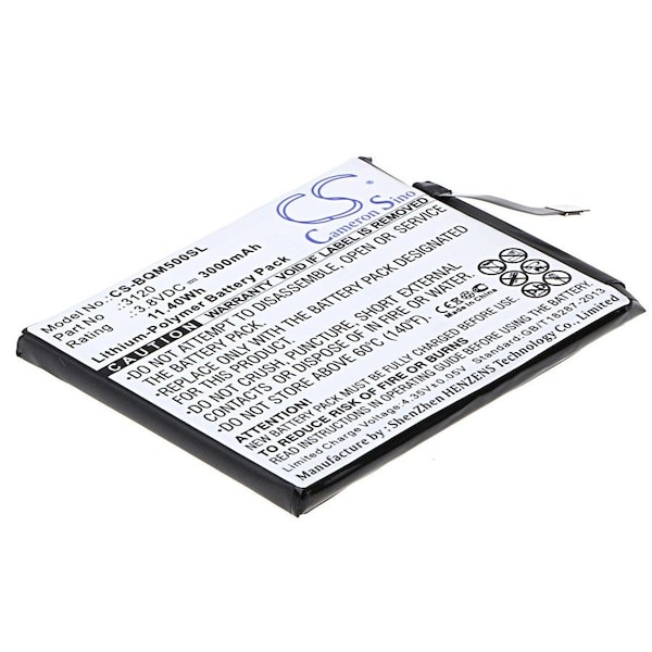 This is a replacement compatible with a BQ Mobile Phone BatteryVolts: 3.8V 3.8 VoltsCapacity: 3000mAh 3AhType: Li-PolymerColor: BlackBQ Aquaris M5 Replacement Batteries.Mfgr Part # 3120Dimensions: 2.83 in. L x 2.33 in. W x 0.18 H in.Weight: 0.2 lbWarranty: 1 YearDisclaimer: Our products are not affiliated with or authorized by BQ.FAQsWhat is the best replacement battery for the BQ Aquaris M5 Mobile Phone Battery?The CS-BQM500SL is the best replacement battery for the BQ Aquaris M5 Mobile Phone Battery. What is your return policy and battery warranty?Our batteries are backed by easy 30-day returns and a 12-month warranty. How do I find the best replacement Battery?Our search tool at the top of the website should give you the best results. Search by brand or part number to see if we have the right match for you. What does Li-ion and Ni-MH mean?They represent different types of rechargeable batteries. Li-ion stands for Lithium Ion, lithium ions move from the negative electrode through an electrolyte to the positive electrode during discharge and back when charging. Ni-MH stands for nickel-metal hydride where the negative electrode is made from a hydrogen-absorbing alloy. Do you have a wholesale, reseller and large volume purchase program?Yes, our bulk purchasing program saves you money and allow you to obtain the batteries you need in one easy, hassle-free transaction. Apply here.