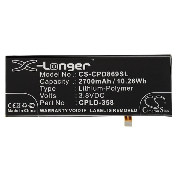 This is a replacement compatible with a Coolpad Mobile Phone BatteryVolts: 3.8V 3.8 VoltsCapacity: 2700mAh 2.7AhType: Li-PolymerColor: BlackCoolpad 8690 8690-T00 X7 Replacement Batteries.Mfgr Part # CPLD-358Dimensions: 4.34 in. L x 1.63 in. W x 0.15 H in.Weight: 0.2 lbWarranty: 1 YearDisclaimer: Our products are not affiliated with or authorized by Coolpad.FAQsWhat is the best replacement battery for the Coolpad 8690 8690-T00 X7 Mobile Phone Battery?The CS-CPD869SL is the best replacement battery for the Coolpad 8690 8690-T00 X7 Mobile Phone Battery. What is your return policy and battery warranty?Our batteries are backed by easy 30-day returns and a 12-month warranty. How do I find the best replacement Battery?Our search tool at the top of the website should give you the best results. Search by brand or part number to see if we have the right match for you. What does Li-ion and Ni-MH mean?They represent different types of rechargeable batteries. Li-ion stands for Lithium Ion, lithium ions move from the negative electrode through an electrolyte to the positive electrode during discharge and back when charging. Ni-MH stands for nickel-metal hydride where the negative electrode is made from a hydrogen-absorbing alloy. Do you have a wholesale, reseller and large volume purchase program?Yes, our bulk purchasing program saves you money and allow you to obtain the batteries you need in one easy, hassle-free transaction. Apply here.