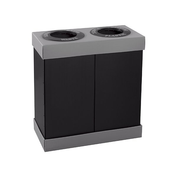 Attractive recycling center for your special events. Moisture-resistant polyethylene; Multiple bin system under 1 lid; Each bin holds 28 gallons; Lightweight and portable; Decals included: Cans, Paper, Plastic and Waste; Assembly required.