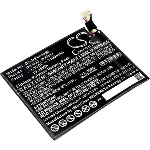This is a replacement compatible with a Dell Tablet BatteryVolts: 3.8V 3.8 VoltsCapacity: 5100mAh 5.1AhType: Li-PolymerColor: BlackDell Venue 8 Pro 5855 Replacement Batteries.Mfgr Part # 0HH8J0 HH8J0 WXR8JDimensions: 4.16 in. L x 3.83 in. W x 0.18 H in.Weight: 0.3 lbWarranty: 1 YearDisclaimer: Our products are not affiliated with or authorized by Dell.FAQsWhat is the best replacement battery for the Dell Venue 8 Pro 5855 Tablet Battery?The CS-DEV858SL is the best replacement battery for the Dell Venue 8 Pro 5855 Tablet Battery. What is your return policy and battery warranty?Our batteries are backed by easy 30-day returns and a 12-month warranty. How do I find the best replacement Battery?Our search tool at the top of the website should give you the best results. Search by brand or part number to see if we have the right match for you. What does Li-ion and Ni-MH mean?They represent different types of rechargeable batteries. Li-ion stands for Lithium Ion, lithium ions move from the negative electrode through an electrolyte to the positive electrode during discharge and back when charging. Ni-MH stands for nickel-metal hydride where the negative electrode is made from a hydrogen-absorbing alloy. Do you have a wholesale, reseller and large volume purchase program?Yes, our bulk purchasing program saves you money and allow you to obtain the batteries you need in one easy, hassle-free transaction. Apply here.