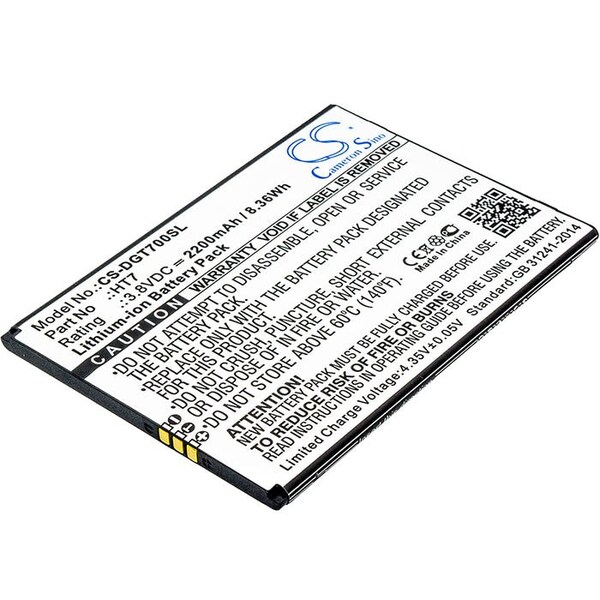 This is a replacement compatible with a Doogee Mobile Phone BatteryVolts: 3.8V 3.8 VoltsCapacity: 2200mAh 2.2AhType: Li-ionColor: BlackDoogee Homtom HT7 T7 T7 Pro Replacement Batteries.Mfgr Part # HT7Dimensions: 3.37 in. L x 2.44 in. W x 0.18 H in.Weight: 0.2 lbWarranty: 1 YearDisclaimer: Our products are not affiliated with or authorized by Doogee.FAQsWhat is the best replacement battery for the Doogee Homtom HT7 T7 T7 Pro Mobile Phone Battery?The CS-DGT700SL is the best replacement battery for the Doogee Homtom HT7 T7 T7 Pro Mobile Phone Battery. What is your return policy and battery warranty?Our batteries are backed by easy 30-day returns and a 12-month warranty. How do I find the best replacement Battery?Our search tool at the top of the website should give you the best results. Search by brand or part number to see if we have the right match for you. What does Li-ion and Ni-MH mean?They represent different types of rechargeable batteries. Li-ion stands for Lithium Ion, lithium ions move from the negative electrode through an electrolyte to the positive electrode during discharge and back when charging. Ni-MH stands for nickel-metal hydride where the negative electrode is made from a hydrogen-absorbing alloy. Do you have a wholesale, reseller and large volume purchase program?Yes, our bulk purchasing program saves you money and allow you to obtain the batteries you need in one easy, hassle-free transaction. Apply here.
