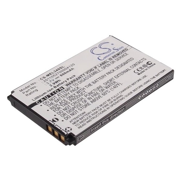 This is a replacement compatible with a Elson Mobile Phone BatteryVolts: 3.7V 3.7 VoltsCapacity: 800mAh 0.8AhType: Li-ionColor: BlackElson EL340 Replacement Batteries.Mfgr Part # 2011052700004120Dimensions: 2.09 in. L x 1.34 in. W x 0.2 H in.Weight: 0.1 lbWarranty: 1 YearDisclaimer: Our products are not affiliated with or authorized by Elson.FAQsWhat is the best replacement battery for the Elson EL340 Mobile Phone Battery?The CS-MEL340SL.1 is the best replacement battery for the Elson EL340 Mobile Phone Battery. What is your return policy and battery warranty?Our batteries are backed by easy 30-day returns and a 12-month warranty. How do I find the best replacement Battery?Our search tool at the top of the website should give you the best results. Search by brand or part number to see if we have the right match for you. What does Li-ion and Ni-MH mean?They represent different types of rechargeable batteries. Li-ion stands for Lithium Ion, lithium ions move from the negative electrode through an electrolyte to the positive electrode during discharge and back when charging. Ni-MH stands for nickel-metal hydride where the negative electrode is made from a hydrogen-absorbing alloy. Do you have a wholesale, reseller and large volume purchase program?Yes, our bulk purchasing program saves you money and allow you to obtain the batteries you need in one easy, hassle-free transaction. Apply here.