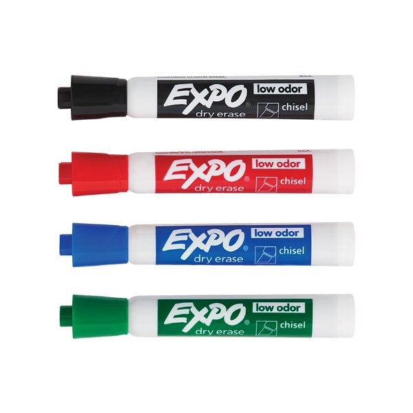 Chisel Tip Markers for use with any dry erase boards. 1 each Red, Green, Blue and Black. This product is equivalent to part number: H-2759.