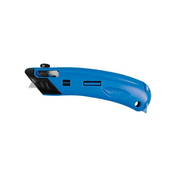 Ambidextrous, guarded, spring-back cutter. No tool blade changes; Blade extension button for convenient tray cuts; Bladeless tape splitting; Ergonomic comfort handle; Spring back safety slider; Stores 5 blades; Includes 1 SP-017 Single-Notch Safety Blade KN216. Sold in a quantity of 12 per case.