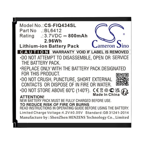 This is a replacement compatible with a FLY Mobile Phone BatteryVolts: 3.7V 3.7 VoltsCapacity: 800mAh 0.8AhType: Li-ionColor: BlackFLY Era Nano 5 IQ434 Replacement Batteries.Mfgr Part # BL6412Dimensions: 3.23 in. L x 2.27 in. W x 0.13 H in.Weight: 0.2 lbWarranty: 1 YearDisclaimer: Our products are not affiliated with or authorized by FLY.FAQsWhat is the best replacement battery for the FLY Era Nano 5 IQ434 Mobile Phone Battery?The CS-FIQ434SL is the best replacement battery for the FLY Era Nano 5 IQ434 Mobile Phone Battery. What is your return policy and battery warranty?Our batteries are backed by easy 30-day returns and a 12-month warranty. How do I find the best replacement Battery?Our search tool at the top of the website should give you the best results. Search by brand or part number to see if we have the right match for you. What does Li-ion and Ni-MH mean?They represent different types of rechargeable batteries. Li-ion stands for Lithium Ion, lithium ions move from the negative electrode through an electrolyte to the positive electrode during discharge and back when charging. Ni-MH stands for nickel-metal hydride where the negative electrode is made from a hydrogen-absorbing alloy. Do you have a wholesale, reseller and large volume purchase program?Yes, our bulk purchasing program saves you money and allow you to obtain the batteries you need in one easy, hassle-free transaction. Apply here.