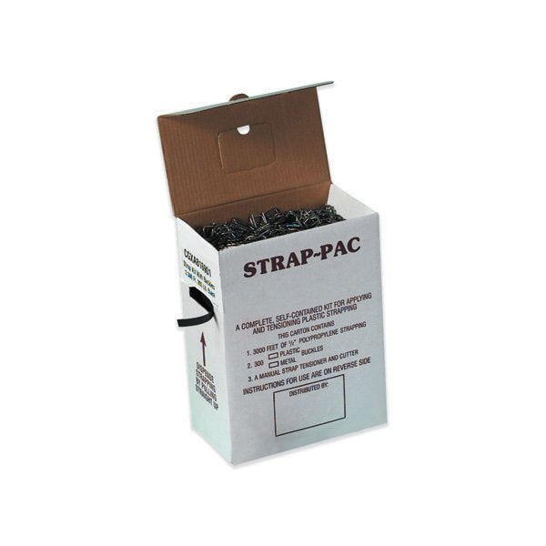 Portable Strapping Kits are self contained and portable for use anywhere in the warehouse. Kits carry everything needed for fast easy strapping applications; Each kit includes a tensioner/cutter; Simply loop poly strapping through buckles, then tighten and cut with the tensioner/cutter; Includes 300 buckles; 400 lb. break strength .017 gauge strapping. This product is equivalent to part number: S-107.