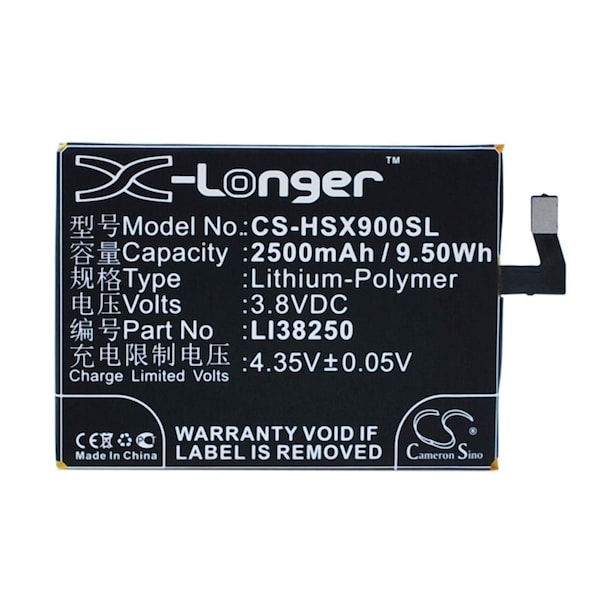 This is a replacement compatible with a Hisense Mobile Phone BatteryVolts: 3.8V 3.8 VoltsCapacity: 2500mAh 2.5AhType: Li-PolymerColor: BlackHisense HS-X5T X5T X9T Replacement Batteries.Mfgr Part # LI38250Dimensions: 2.88 in. L x 2.12 in. W x 0.17 H in.Weight: 0.1 lbWarranty: 1 YearDisclaimer: Our products are not affiliated with or authorized by Hisense.FAQsWhat is the best replacement battery for the Hisense HS-X5T X5T X9T Mobile Phone Battery?The CS-HSX900SL is the best replacement battery for the Hisense HS-X5T X5T X9T Mobile Phone Battery. What is your return policy and battery warranty?Our batteries are backed by easy 30-day returns and a 12-month warranty. How do I find the best replacement Battery?Our search tool at the top of the website should give you the best results. Search by brand or part number to see if we have the right match for you. What does Li-ion and Ni-MH mean?They represent different types of rechargeable batteries. Li-ion stands for Lithium Ion, lithium ions move from the negative electrode through an electrolyte to the positive electrode during discharge and back when charging. Ni-MH stands for nickel-metal hydride where the negative electrode is made from a hydrogen-absorbing alloy. Do you have a wholesale, reseller and large volume purchase program?Yes, our bulk purchasing program saves you money and allow you to obtain the batteries you need in one easy, hassle-free transaction. Apply here.