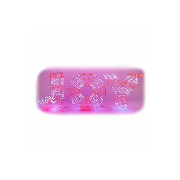 Holiday Wonderland 24H Metal Frame JOY Wrapped With 975 Red and Cool White Micro Dot LEDs. Clear Wire 40 spacing between each letter 72 Lead Wire Includes UL Adaptor Indoor/Outdoor Use. Includes 6 lawn stakes. Zip ties included. Color Box. Holiday Wonderland packaging.