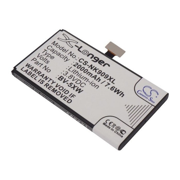 This is a replacement compatible with a Microsoft Mobile Phone BatteryVolts: 3.8V 3.8 VoltsCapacity: 2000mAh 2AhType: Li-ionColor: BlackMicrosoft Lumia 1020 Lumia 909 Replacement Batteries.Mfgr Part # BV-5XWDimensions: 2.72 in. L x 1.52 in. W x 0.23 H in.Weight: 0.1 lbWarranty: 1 YearDisclaimer: Our products are not affiliated with or authorized by Microsoft.FAQsWhat is the best replacement battery for the Microsoft Lumia 1020 Lumia 909 Mobile Phone Battery?The CS-NK909XL.1 is the best replacement battery for the Microsoft Lumia 1020 Lumia 909 Mobile Phone Battery. What is your return policy and battery warranty?Our batteries are backed by easy 30-day returns and a 12-month warranty. How do I find the best replacement Battery?Our search tool at the top of the website should give you the best results. Search by brand or part number to see if we have the right match for you. What does Li-ion and Ni-MH mean?They represent different types of rechargeable batteries. Li-ion stands for Lithium Ion, lithium ions move from the negative electrode through an electrolyte to the positive electrode during discharge and back when charging. Ni-MH stands for nickel-metal hydride where the negative electrode is made from a hydrogen-absorbing alloy. Do you have a wholesale, reseller and large volume purchase program?Yes, our bulk purchasing program saves you money and allow you to obtain the batteries you need in one easy, hassle-free transaction. Apply here.