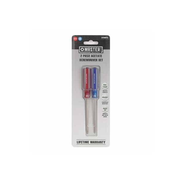 Master Mechanic 2 piece acetate screwdriver set. Set consists of PH0 x 3 and 3/32 x 3 screwdrivers.