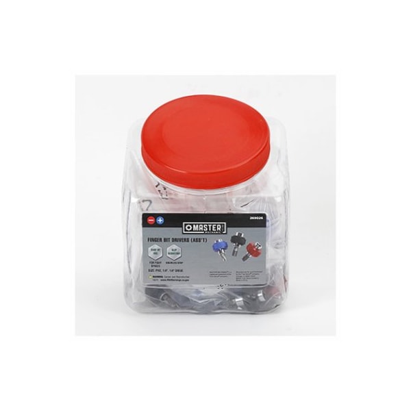 Master Mechanic assorted finger bit drivers. Finger bit drivers included are 10 each of the following: Phillips PH2 1/4 slotted and 1/4 drive adaptor bits in a fishbowl. Color-coded.