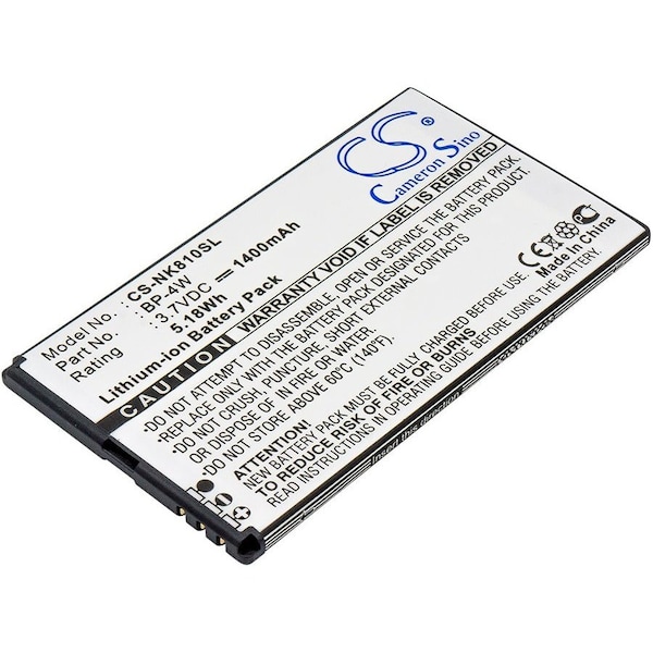This is a replacement compatible with a Nokia Mobile Phone BatteryVolts: 3.7V 3.7 VoltsCapacity: 1400mAh 1.4AhType: Li-ionColor: BlackNokia Lumia 810 Lumia 822 Replacement Batteries.Mfgr Part # BP-4WDimensions: 3.27 in. L x 1.9 in. W x 0.17 H in.Weight: 0.1 lbWarranty: 1 YearDisclaimer: Our products are not affiliated with or authorized by Nokia.FAQsWhat is the best replacement battery for the Nokia Lumia 810 Lumia 822 1400mAh Mobile Phone Battery?The CS-NK810SL is the best replacement battery for the Nokia Lumia 810 Lumia 822 1400mAh Mobile Phone Battery. What is your return policy and battery warranty?Our batteries are backed by easy 30-day returns and a 12-month warranty. How do I find the best replacement Battery?Our search tool at the top of the website should give you the best results. Search by brand or part number to see if we have the right match for you. What does Li-ion and Ni-MH mean?They represent different types of rechargeable batteries. Li-ion stands for Lithium Ion, lithium ions move from the negative electrode through an electrolyte to the positive electrode during discharge and back when charging. Ni-MH stands for nickel-metal hydride where the negative electrode is made from a hydrogen-absorbing alloy. Do you have a wholesale, reseller and large volume purchase program?Yes, our bulk purchasing program saves you money and allow you to obtain the batteries you need in one easy, hassle-free transaction. Apply here.