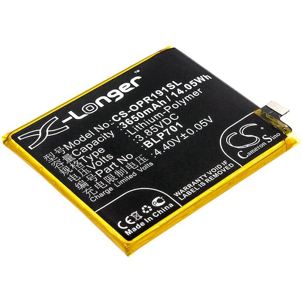 This is a replacement compatible with a Oppo Mobile Phone BatteryVolts: 3.85V 3.85 VoltsCapacity: 3650mAh 3.65AhType: Li-PolymerColor: BlackOppo 1917 CPH1917 PCAM00 Reno Replacement Batteries.Mfgr Part # BLP701Dimensions: 2.81 in. L x 2.44 in. W x 0.19 H in.Weight: 0.2 lbWarranty: 1 YearDisclaimer: Our products are not affiliated with or authorized by Oppo.FAQsWhat is the best replacement battery for the Oppo 1917 CPH1917 PCAM00 Reno Mobile Phone Battery?The CS-OPR191SL is the best replacement battery for the Oppo 1917 CPH1917 PCAM00 Reno Mobile Phone Battery. What is your return policy and battery warranty?Our batteries are backed by easy 30-day returns and a 12-month warranty. How do I find the best replacement Battery?Our search tool at the top of the website should give you the best results. Search by brand or part number to see if we have the right match for you. What does Li-ion and Ni-MH mean?They represent different types of rechargeable batteries. Li-ion stands for Lithium Ion, lithium ions move from the negative electrode through an electrolyte to the positive electrode during discharge and back when charging. Ni-MH stands for nickel-metal hydride where the negative electrode is made from a hydrogen-absorbing alloy. Do you have a wholesale, reseller and large volume purchase program?Yes, our bulk purchasing program saves you money and allow you to obtain the batteries you need in one easy, hassle-free transaction. Apply here.