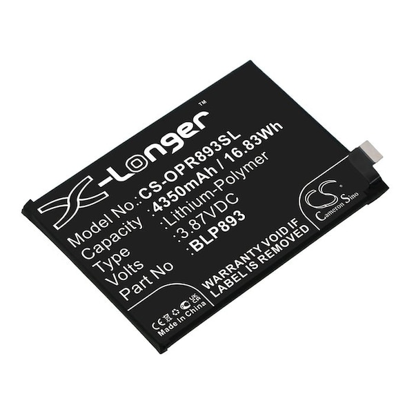 This is a replacement compatible with a OPPO Mobile Phone BatteryVolts: 3.87V 3.87 VoltsCapacity: 4350mAh 4.35AhType: Li-PolymerColor: BlackOPPO PFJM10 Reno 7 Reno 7 5G Replacement Batteries.Mfgr Part # BLP893Dimensions: 3.52 in. L x 2.46 in. W x 0.17 H in.Weight: 0.2 lbWarranty: 1 YearDisclaimer: Our products are not affiliated with or authorized by OPPO.FAQsWhat is the best replacement battery for the OPPO PFJM10 Reno 7 Reno 7 5G Mobile Phone Battery?The CS-OPR893SL is the best replacement battery for the OPPO PFJM10 Reno 7 Reno 7 5G Mobile Phone Battery. What is your return policy and battery warranty?Our batteries are backed by easy 30-day returns and a 12-month warranty. How do I find the best replacement Battery?Our search tool at the top of the website should give you the best results. Search by brand or part number to see if we have the right match for you. What does Li-ion and Ni-MH mean?They represent different types of rechargeable batteries. Li-ion stands for Lithium Ion, lithium ions move from the negative electrode through an electrolyte to the positive electrode during discharge and back when charging. Ni-MH stands for nickel-metal hydride where the negative electrode is made from a hydrogen-absorbing alloy. Do you have a wholesale, reseller and large volume purchase program?Yes, our bulk purchasing program saves you money and allow you to obtain the batteries you need in one easy, hassle-free transaction. Apply here.