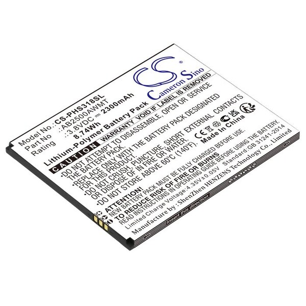 This is a replacement compatible with a Philips Mobile Phone BatteryVolts: 3.7V 3.7 VoltsCapacity: 2300mAh 2.3AhType: Li-ionPhilips CTS318 Xenium S318 Replacement Batteries.Mfgr Part # AB2500AWMTWeight: 0.2 lbWarranty: 1 YearDisclaimer: Our products are not affiliated with or authorized by Philips.FAQsWhat is the best replacement battery for the Philips CTS318 Xenium S318 Mobile Phone Battery?The CS-PHS318SL is the best replacement battery for the Philips CTS318 Xenium S318 Mobile Phone Battery. What is your return policy and battery warranty?Our batteries are backed by easy 30-day returns and a 12-month warranty. How do I find the best replacement Battery?Our search tool at the top of the website should give you the best results. Search by brand or part number to see if we have the right match for you. What does Li-ion and Ni-MH mean?They represent different types of rechargeable batteries. Li-ion stands for Lithium Ion, lithium ions move from the negative electrode through an electrolyte to the positive electrode during discharge and back when charging. Ni-MH stands for nickel-metal hydride where the negative electrode is made from a hydrogen-absorbing alloy. Do you have a wholesale, reseller and large volume purchase program?Yes, our bulk purchasing program saves you money and allow you to obtain the batteries you need in one easy, hassle-free transaction. Apply here.
