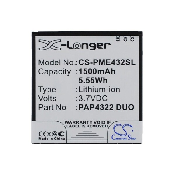 This is a replacement compatible with a Prestigio Mobile Phone BatteryVolts: 3.7V 3.7 VoltsCapacity: 1500mAh 1.5AhType: Li-ionColor: BlackPrestigio MultiPhone 4322 Duo Replacement Batteries.Mfgr Part # PAP4322 DUODimensions: 2.03 in. L x 2.01 in. W x 0.21 H in.Weight: 0.1 lbWarranty: 1 YearDisclaimer: Our products are not affiliated with or authorized by Prestigio.FAQsWhat is the best replacement battery for the Prestigio MultiPhone 4322 Duo Mobile Phone Battery?The CS-PME432SL is the best replacement battery for the Prestigio MultiPhone 4322 Duo Mobile Phone Battery. What is your return policy and battery warranty?Our batteries are backed by easy 30-day returns and a 12-month warranty. How do I find the best replacement Battery?Our search tool at the top of the website should give you the best results. Search by brand or part number to see if we have the right match for you. What does Li-ion and Ni-MH mean?They represent different types of rechargeable batteries. Li-ion stands for Lithium Ion, lithium ions move from the negative electrode through an electrolyte to the positive electrode during discharge and back when charging. Ni-MH stands for nickel-metal hydride where the negative electrode is made from a hydrogen-absorbing alloy. Do you have a wholesale, reseller and large volume purchase program?Yes, our bulk purchasing program saves you money and allow you to obtain the batteries you need in one easy, hassle-free transaction. Apply here.