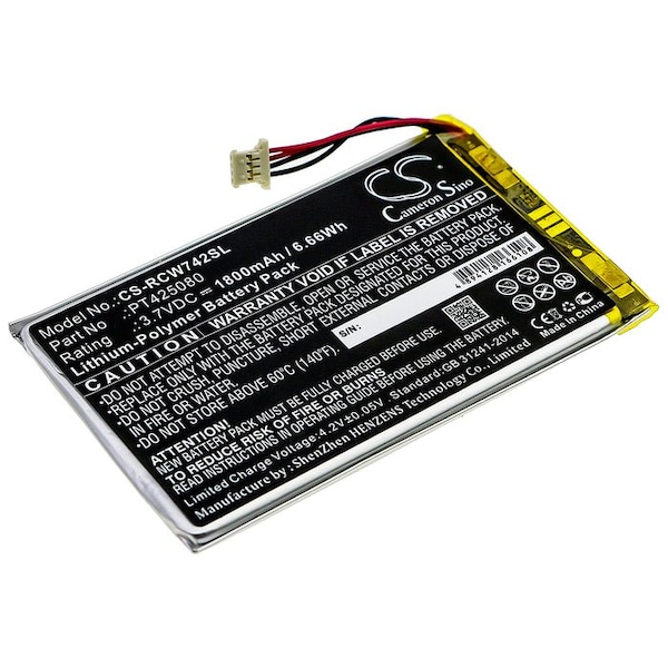 This is a replacement compatible with a RCA Tablet BatteryVolts: 3.7V 3.7 VoltsCapacity: 1800mAh 1.8AhType: Li-PolymerColor: BlackRCA T6873w42 Voyager II 7in Replacement Batteries.Mfgr Part # PT425080Dimensions: 3.38 in. L x 1.97 in. W x 0.14 H in.Weight: 0.2 lbWarranty: 1 YearDisclaimer: Our products are not affiliated with or authorized by RCA.FAQsWhat is the best replacement battery for the RCA T6873w42 Voyager II 7in Tablet Battery?The CS-RCW742SL is the best replacement battery for the RCA T6873w42 Voyager II 7in Tablet Battery. What is your return policy and battery warranty?Our batteries are backed by easy 30-day returns and a 12-month warranty. How do I find the best replacement Battery?Our search tool at the top of the website should give you the best results. Search by brand or part number to see if we have the right match for you. What does Li-ion and Ni-MH mean?They represent different types of rechargeable batteries. Li-ion stands for Lithium Ion, lithium ions move from the negative electrode through an electrolyte to the positive electrode during discharge and back when charging. Ni-MH stands for nickel-metal hydride where the negative electrode is made from a hydrogen-absorbing alloy. Do you have a wholesale, reseller and large volume purchase program?Yes, our bulk purchasing program saves you money and allow you to obtain the batteries you need in one easy, hassle-free transaction. Apply here.