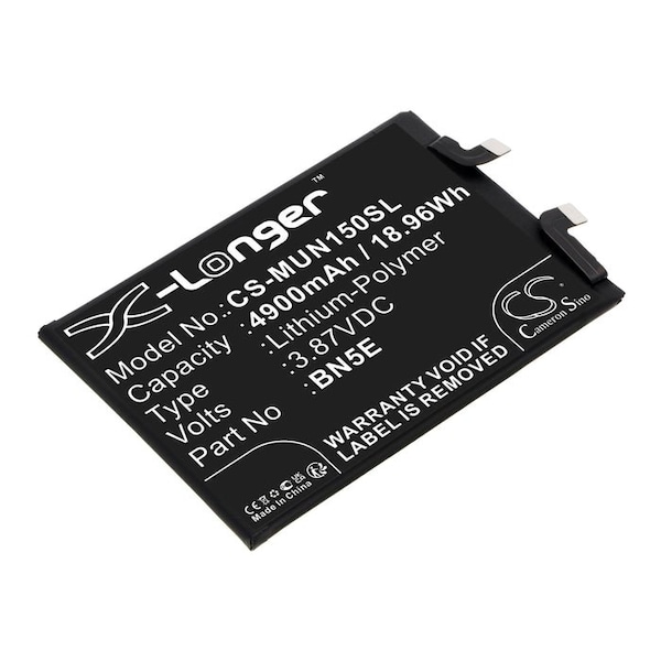 This is a replacement compatible with a Redmi Mobile Phone BatteryVolts: 3.87V 3.87 VoltsCapacity: 4900mAh 4.9AhType: Li-PolymerColor: BlackRedmi Note 11E Pro Replacement Batteries.Mfgr Part # BN5EDimensions: 3.67 in. L x 2.56 in. W x 0.19 H in.Weight: 0.3 lbWarranty: 1 YearDisclaimer: Our products are not affiliated with or authorized by Redmi.FAQsWhat is the best replacement battery for the Redmi Note 11E Pro Mobile Phone Battery?The CS-MUN150SL.1 is the best replacement battery for the Redmi Note 11E Pro Mobile Phone Battery. What is your return policy and battery warranty?Our batteries are backed by easy 30-day returns and a 12-month warranty. How do I find the best replacement Battery?Our search tool at the top of the website should give you the best results. Search by brand or part number to see if we have the right match for you. What does Li-ion and Ni-MH mean?They represent different types of rechargeable batteries. Li-ion stands for Lithium Ion, lithium ions move from the negative electrode through an electrolyte to the positive electrode during discharge and back when charging. Ni-MH stands for nickel-metal hydride where the negative electrode is made from a hydrogen-absorbing alloy. Do you have a wholesale, reseller and large volume purchase program?Yes, our bulk purchasing program saves you money and allow you to obtain the batteries you need in one easy, hassle-free transaction. Apply here.