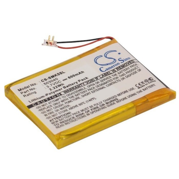 This is a replacement compatible with a Samsung Media Player BatteryVolts: 3.7V 3.7 VoltsCapacity: 600mAh 0.6AhType: Li-PolymerColor: BlackSamsung YP-K5 YP-K5J Replacement Batteries.Mfgr Part # 503040Dimensions: 1.58 in. L x 1.15 in. W x 0.18 H in.Weight: 0.1 lbWarranty: 1 YearDisclaimer: Our products are not affiliated with or authorized by Samsung.FAQsWhat is the best replacement battery for the Samsung YP-K5 YP-K5J Media Player Battery?The CS-SMK5SL is the best replacement battery for the Samsung YP-K5 YP-K5J Media Player Battery. What is your return policy and battery warranty?Our batteries are backed by easy 30-day returns and a 12-month warranty. How do I find the best replacement Battery?Our search tool at the top of the website should give you the best results. Search by brand or part number to see if we have the right match for you. What does Li-ion and Ni-MH mean?They represent different types of rechargeable batteries. Li-ion stands for Lithium Ion, lithium ions move from the negative electrode through an electrolyte to the positive electrode during discharge and back when charging. Ni-MH stands for nickel-metal hydride where the negative electrode is made from a hydrogen-absorbing alloy. Do you have a wholesale, reseller and large volume purchase program?Yes, our bulk purchasing program saves you money and allow you to obtain the batteries you need in one easy, hassle-free transaction. Apply here.