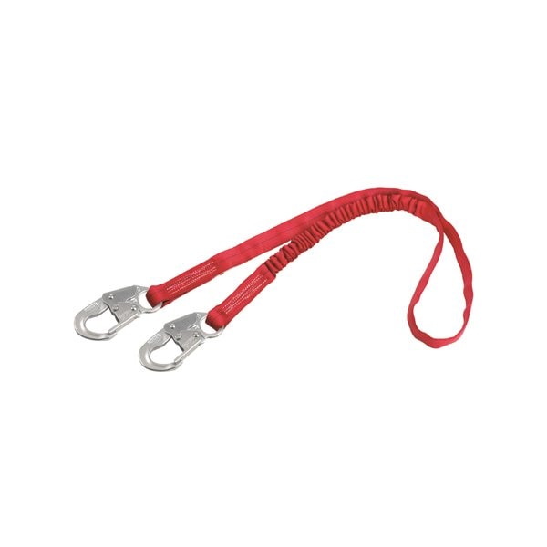 Energy absorbing design limits fall arrest forces. 6 Foot, single-leg lanyard is long enough to be user friendly, but kept as short as possible to minimize free fall distance; Constructed from abrasion resistant tubular polyester webbing; User friendly, self locking snap hooks at each end automatically locks and closes for added safety; Unique inner core immediately begins to extend and absorb energy during a fall; Rugged construction stands up to long periods of exposure to elements; Impact indicator allows user to visually see if the lanyard has been involved in a fall, providing for safe, simple and reliable inspections. This product is equivalent to part number: H-858.