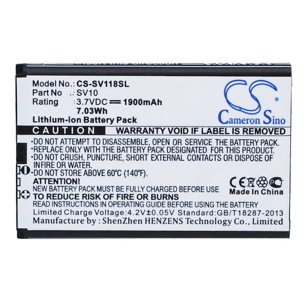 This is a replacement compatible with a Sieval Survey Multimeter and Equipment BatteryVolts: 3.7V 3.7 VoltsCapacity: 1900mAh 1.9AhType: Li-ionColor: BlackSieval SV-118 Replacement Batteries.Mfgr Part # SV10Dimensions: 2.51 in. L x 1.61 in. W x 0.24 H in.Weight: 0.1 lbWarranty: 1 YearDisclaimer: Our products are not affiliated with or authorized by Sieval.FAQsWhat is the best replacement battery for the Sieval SV-118 Survey Multimeter and Equipment Battery?The CS-SV118SL is the best replacement battery for the Sieval SV-118 Survey Multimeter and Equipment Battery. What is your return policy and battery warranty?Our batteries are backed by easy 30-day returns and a 12-month warranty. How do I find the best replacement Battery?Our search tool at the top of the website should give you the best results. Search by brand or part number to see if we have the right match for you. What does Li-ion and Ni-MH mean?They represent different types of rechargeable batteries. Li-ion stands for Lithium Ion, lithium ions move from the negative electrode through an electrolyte to the positive electrode during discharge and back when charging. Ni-MH stands for nickel-metal hydride where the negative electrode is made from a hydrogen-absorbing alloy. Do you have a wholesale, reseller and large volume purchase program?Yes, our bulk purchasing program saves you money and allow you to obtain the batteries you need in one easy, hassle-free transaction. Apply here.